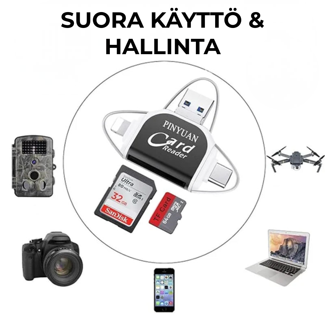 Tämä 4-in-1 SD/TF-kortinlukija tekee tiedostojen jakamisesta ja hallinnasta vaivatonta. Yhteensopivuus USB-, USB-C-, micro-USB- ja Lightning-liitäntöjen kanssa varmistaa, että voit käyttää sitä lähes kaikilla laitteilla – iPhoneista ja Android-puhelimista kannettaviin tietokoneisiin ja tabletteihin. Olitpa kotona, toimistolla tai matkalla, tämä laite on täydellinen kumppani!