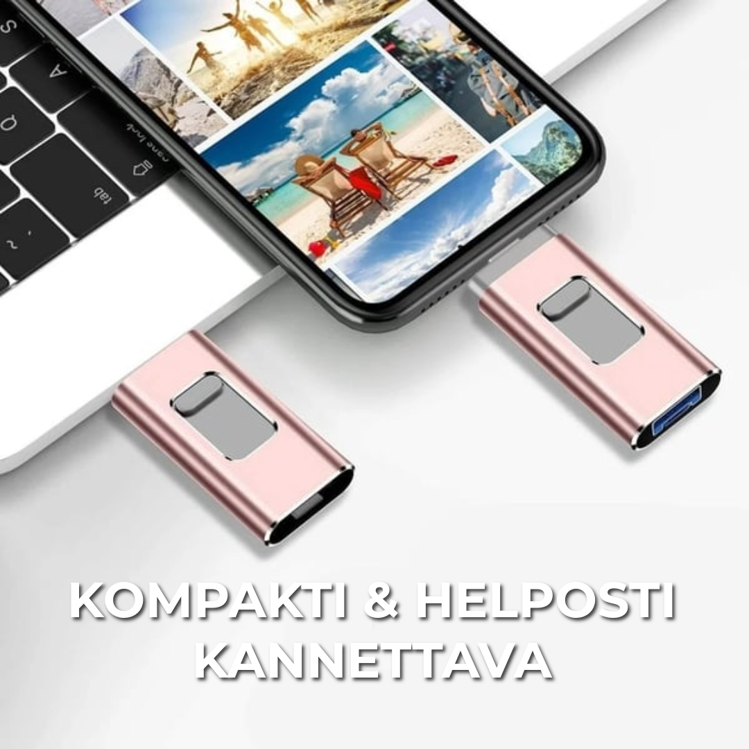 Käytätkö iPhonea, Androidia, Windows-PC:tä tai MacBookia? Tämä muistitikku toimii saumattomasti kaikilla laitteilla. USB-, Type-C- ja Lightning-liitäntöjen ansiosta siirrät tiedostot ilman johtoja tai hankalia sovelluksia. Yksi ratkaisu, loputtomasti mahdollisuuksia.