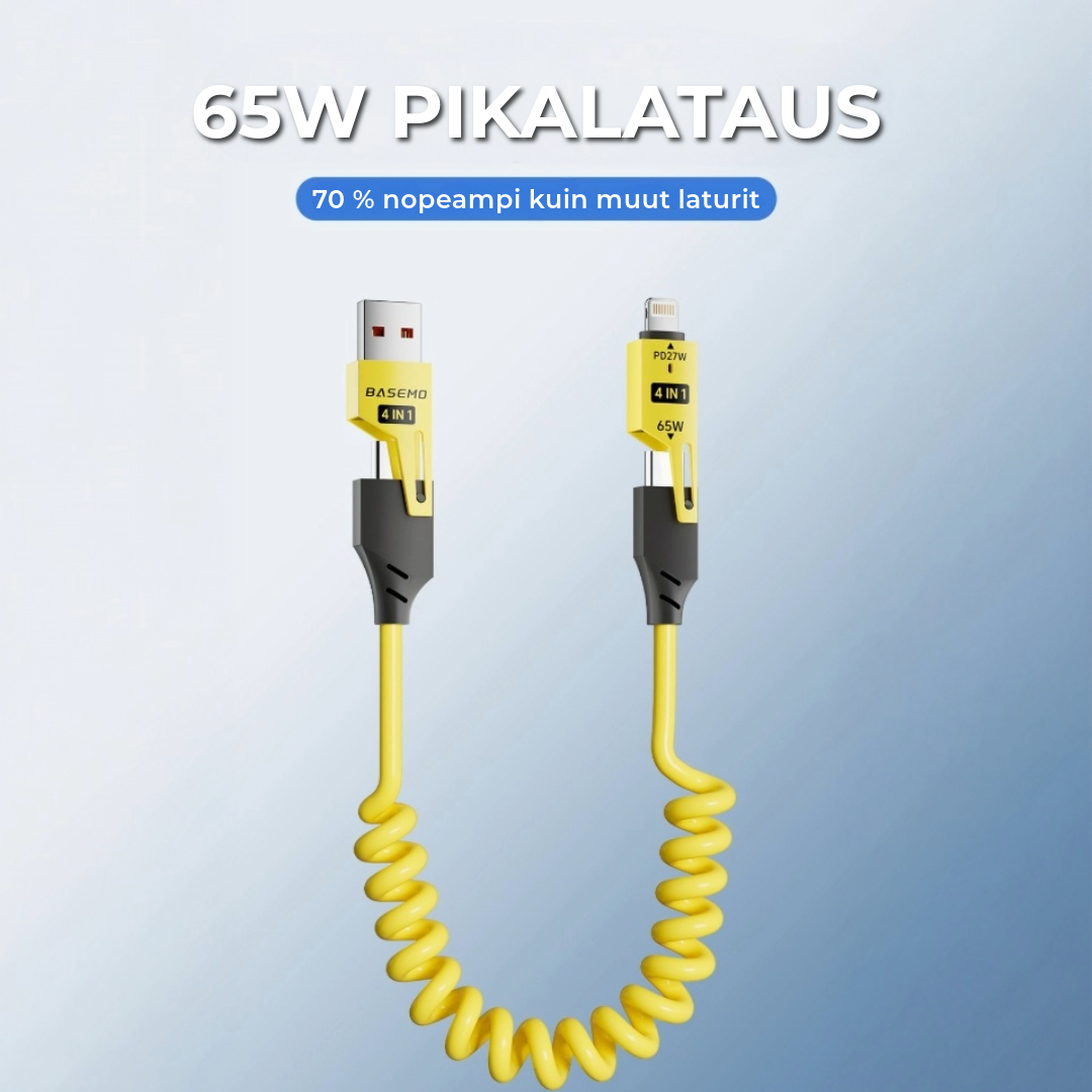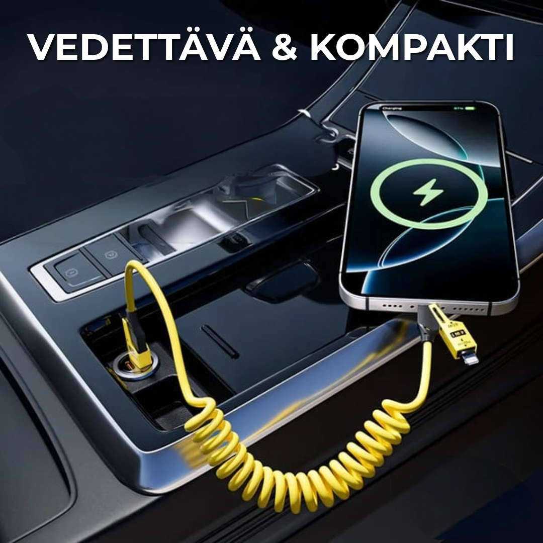 Ei enää etsimistä oikean kaapelin perään, ei enää sekasotkua laukussasi, ja aina nopea ja vaivaton laiteiden lataus. 4-in-1 Vedettävä Laturi on täydellinen ratkaisu kaikkiin lataustarpeisiisi – yksi kaapeli, loputtomasti mahdollisuuksia!