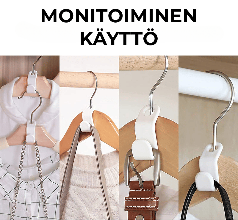 Tämä innovatiivinen ripustusjärjestelmä mahdollistaa jopa 12 vaatteen ripustamisen yhden henkarin tilaan. Vapauta heti tilaa lisää vaatekaappiisi – enemmän vaatteita tai parempaa järjestystä varten.