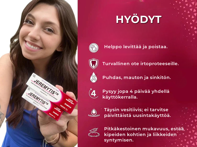 Koe ero heti ensimmäisestä käytöstä lähtien! Tämä hammasproteesivoide tuo välittömän helpotuksen vähentäenkipuajaärsytystä, jotta voit nauttia päivittäisestä elämästä ilman epämukavuutta.