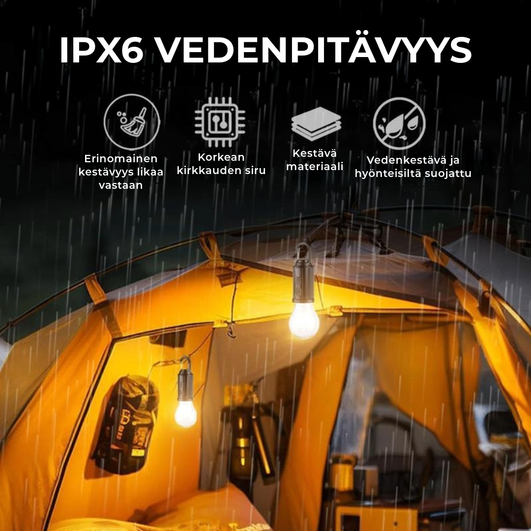 IPX6-vedenpitävyyden ansiosta tämä lamppu kestää sateen ja roiskeet, ja kestävä, taitettava koukku pitää sen kiinni puussa, narussa tai teltassa ilman kaatumista. Ei huolia sään suhteen – ole rauhassa valon kanssa, joka kestää aina!