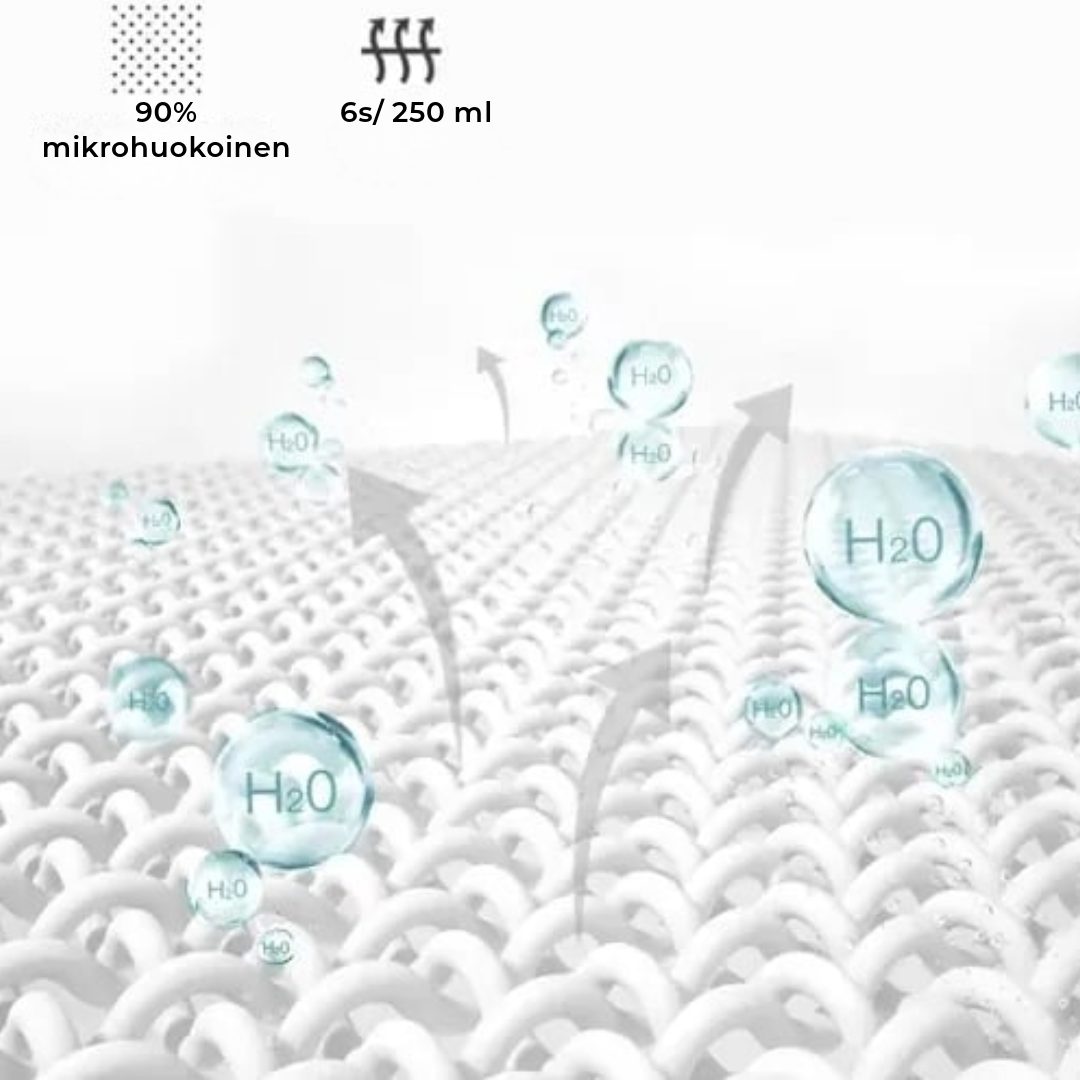 Imukyky, joka pystyy imeyttämään vettä 2-3 kertaa oman painonsa verran90 % mikroporeilla, pitää tämän maton työtasosi aina kuivana ja raikkaana. Nauti mielenrauhasta ratkaisulla, joka estää homeen ja suojaa terveyttäsi – fiksu valinta kotiisi!