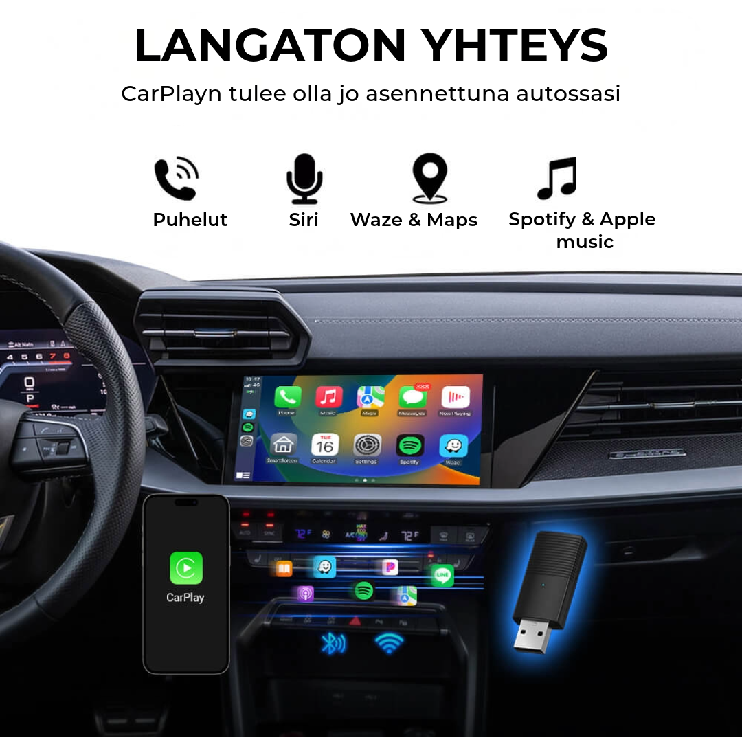 Ei enää sotkuisia johtoja tai puhelimen jatkuvaa kytkemistä ja irrottamista. Mini Langaton CarPlay -adapteri muuntaa langallisen CarPlayn tai Android Auton täysin langattomaksi kokemukseksi, jolloin olet aina heti yhteydessä.