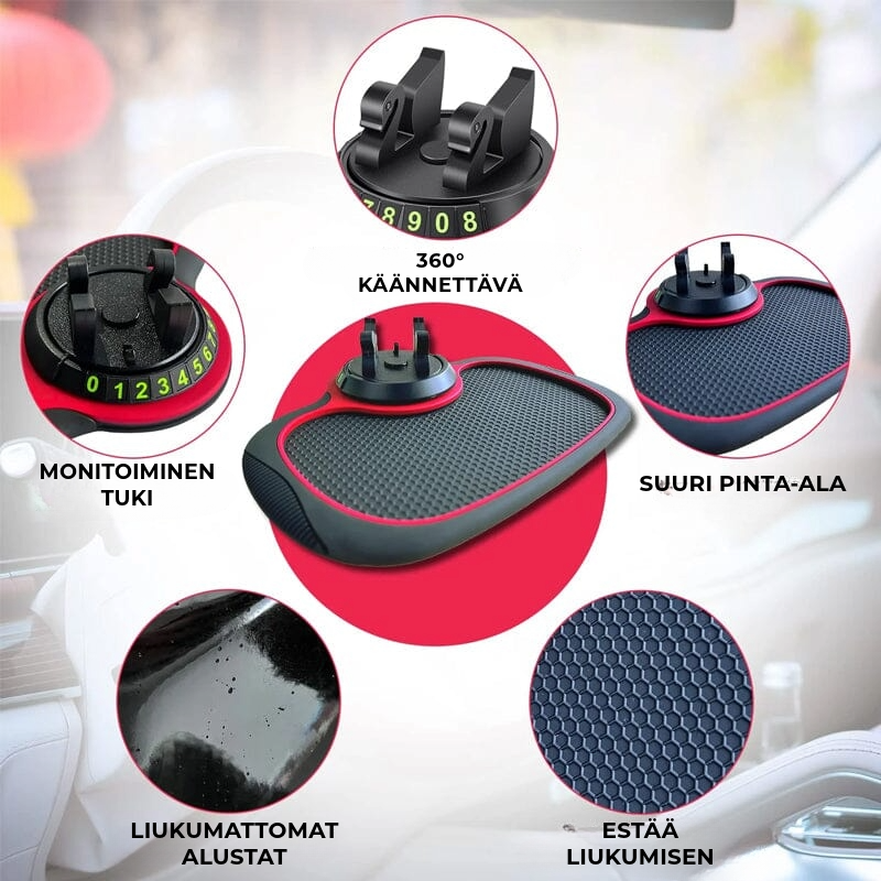 Tämä monitoimimatto toimii paitsi puhelintelineenä myös, liukumattomana kojelaudanmattona ja pienten tavaroiden järjestäjänä. Se pitää puhelimeni, kortit ja muut tärkeät esineesi kätevästi käsillä ja turvallisesti paikoillaan.