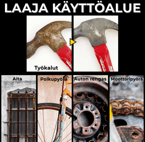 Ruosteenpoistosuihkeemme toimii kaikenlaisilla materiaaleilla, kuten metalli, kromi ja maalatut pinnat.. Se on tTäydellinen valinta autoille, työkaluille, keittiölaitteille, puutarhakalusteille ja muuhun.
