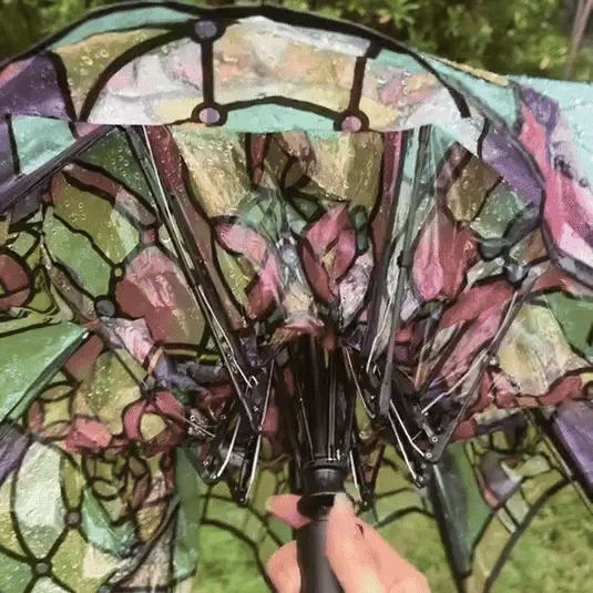 Tämä vintage-sateenvarjo on enemmän kuin pelkkä sadesuoja – se on liikkuva taideteos. Lasimaalauksesta inspiroitu muotoilu luo lumoavan, värikkään varjon, joka muuttaa jokaisen sadepäivän romanttiseksi runoksi.